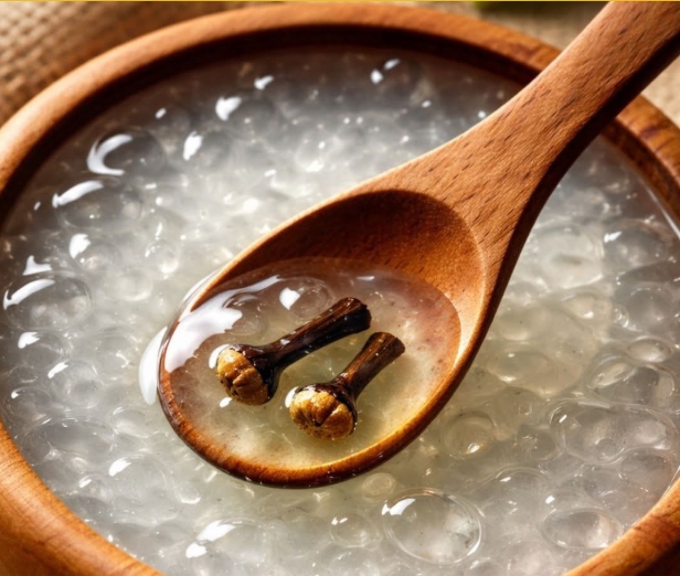 Baharatları demleyin: 250 ml suyu nazikçe kaynatın. Karanfil, zencefil ve zerdeçalı ekleyin. Aktif bileşikleri (öjenol, gingeroller, kurkuminoidleri) çıkarmak için düşük ateşte 5 dakika kaynatın. Hafifçe soğutun.
